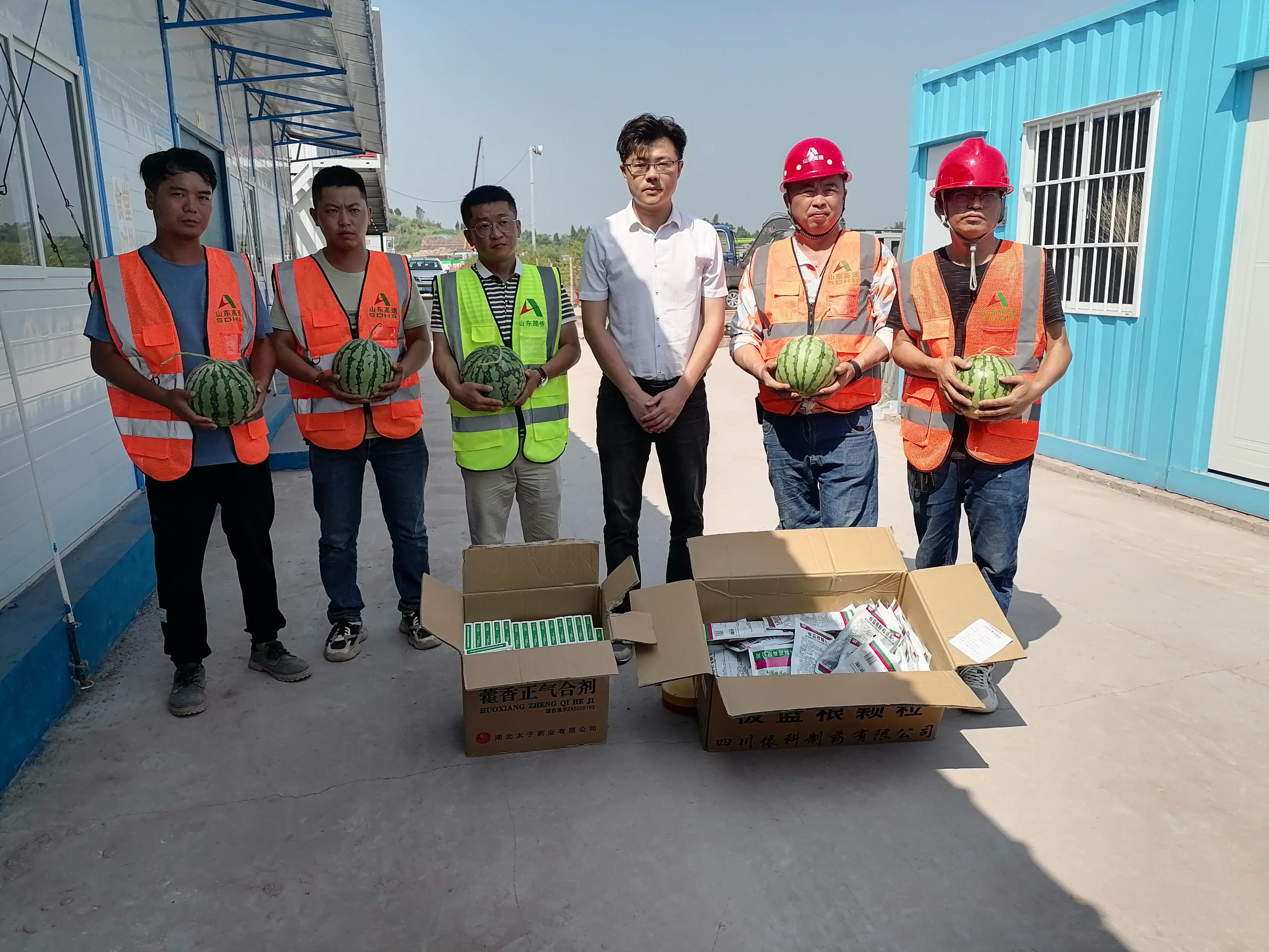 每到一個(gè)項(xiàng)目施工現(xiàn)場(chǎng),周士棠同志都深入一線職工當(dāng)中,與大家親切交談,親自將一個(gè)個(gè)西瓜,一盒盒防暑藥品發(fā)放到大家手中,細(xì)致詢問(wèn)大家近期的生活情況和工作情況,實(shí)地查看項(xiàng)目進(jìn)展情況。了解到員工在近40攝氏度的酷熱下依舊堅(jiān)持高溫作業(yè),加班加點(diǎn)堅(jiān)守施工一線,爭(zhēng)分奪秒比質(zhì)量搶進(jìn)度后,周士棠同志對(duì)大家在高溫天氣仍堅(jiān)守崗位、辛苦勞動(dòng)付出的精神表示高度肯定與贊揚(yáng)。